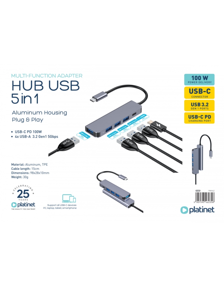 • PLATINET MEDIA HUB USB-C TO 4X USB-A 3.2 GEN1 + 1X USB-C PD 100W 5IN1 ALUMINIUM