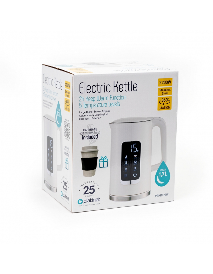 • PLATINET KETTLE LCD DISPLAY 1,7L 5 TEMPERATURE SETTINGS + 450 ML TRAVEL MUG, WHITE